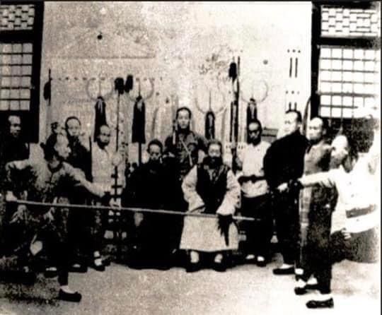 In this famous photo you'll see sitting in the center right side (from our point of view) Guo Yun Shen . Guo taught the I Chuan founder Wang Xiang Zhai as well as Sun Lutang . "Guo Was imprisoned for three years after killing a man in one punch in a duel with his crushing fist; even though he and his opponent signed documents releasing them from legal liability (since it only took one blow ,it was considered murder) he was imprisoned .While in prison he developed his characteristic halfstep crushing fist which we still practice to this day in our lineage of Hsing I Chuan .